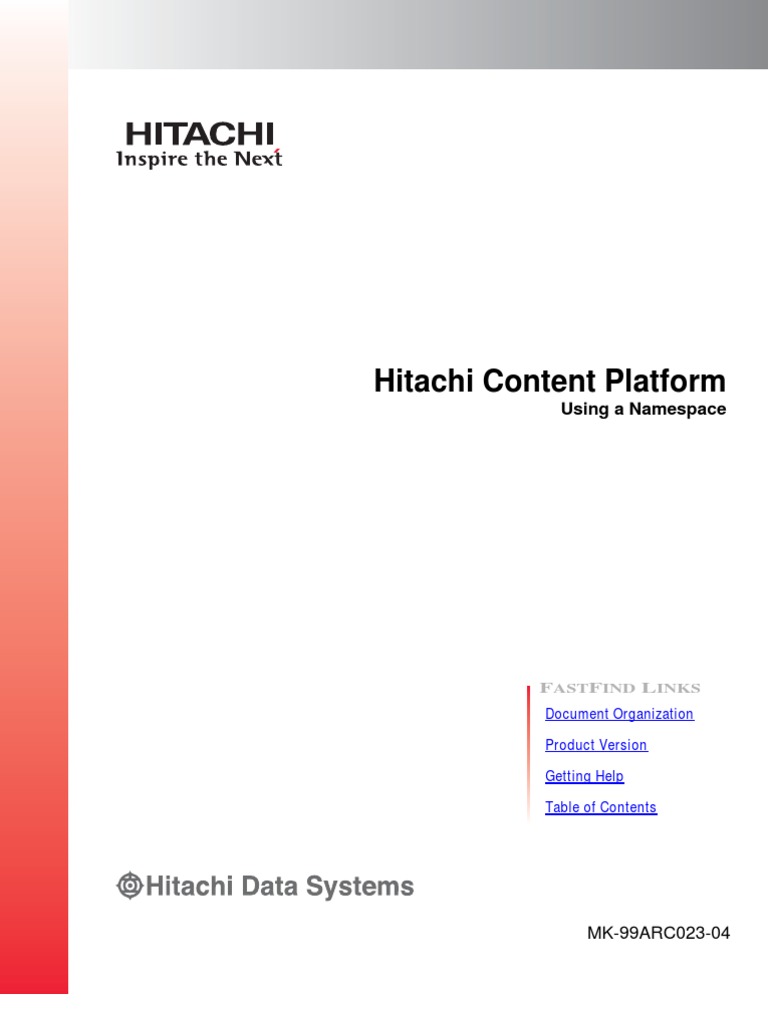 This book is your guide to working with Hitachi Content Platform (HCP) namespaces. It introduces HCP concepts and describes how HCP represents content using familiar data structures. It includes instructions for accessing a namespace and explains how to store, view, retrieve, and delete objects in a namespace, as well as how to change object metadata such as retention and shred settings. It also contains usage considerations to help you work more effectively with namespaces. This book does not discuss using the default namespace. For information on that namespace, see Using the Default Namespace. Note: Throughout this book, the word Unix is used to represent all UNIXlike operating systems (such as UNIX itself or Linux).