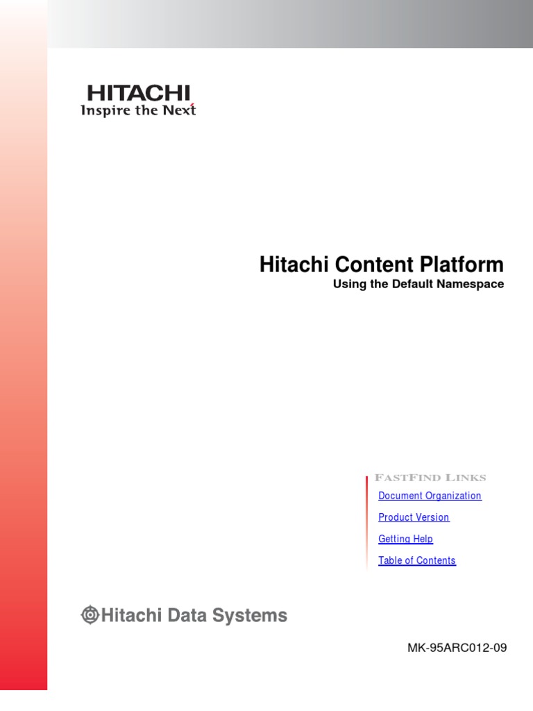 This book is your guide to working with the default namespace for an Hitachi Content Platform (HCP) system. It introduces HCP concepts and describes how HCP represents namespace content using familiar data structures. It includes instructions for accessing the namespace using the supported namespace access protocols and explains how to store, view, retrieve, and delete objects in the namespace, as well as how to change object metadata such as retention and permissions. It also contains usage considerations to help you work more effectively with the namespace. Note: Throughout this book, the word Unix is used to represent all UNIXlike operating systems (such as UNIX itself or Linux).