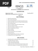 QUESTION BANK UNIT I PART A 1. Define Environmental studies. 2. What are the principles of environmental education? 3. Mention the scope and importance of Environmental studies. 4. How forests are useful to mankind? 5. What is mining? Mention the methods of mining. 6. Enumerate the effects of mining on the environment. 7. What are Dams? How is it useful to human beings? 8. Discuss the problems of over-exploitation of Ground water. 9. What are the methods of flood control? 10. What are the up-stream impacts of constsruction of dams? 11. Define under-nutrition & mal-nutrition. 12. What are the merits of using renewable energy resources? 13. Why alternate energy resources are required? 14. What is the application of wind energy? 15. Write a note on Geo-Thermal energy. 16. What is soil erosion? 17. Differentiate between renewable & non-renewable energy resources. 18. Mention the advantages & disadvantages of modern agriculture. 19. Differentiate between organic and synthetic fertilizers. 20. What is an aquifer? Mention its types.