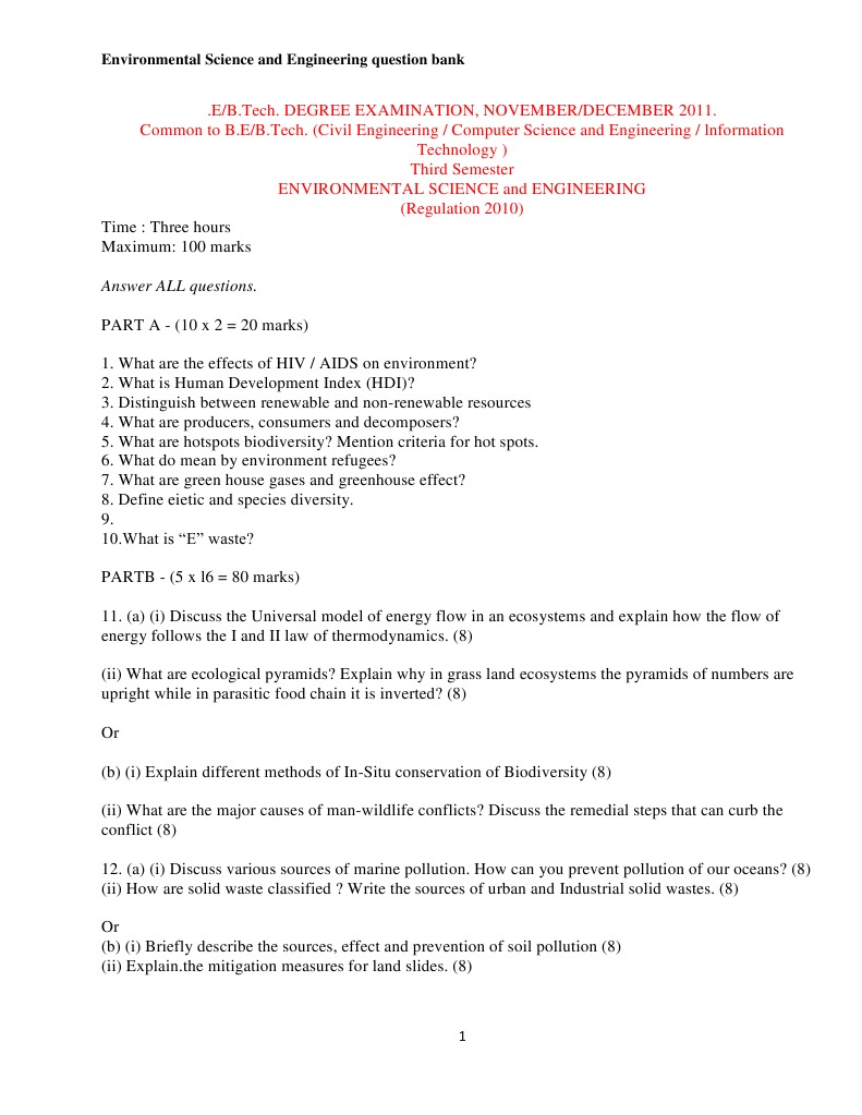 .E/B.Tech. DEGREE EXAMINATION, NOVEMBER/DECEMBER 2011. Common to B.E/B.Tech. (Civil Engineering / Computer Science and Engineering / lnformation Technology ) Third Semester ENVIRONMENTAL SCIENCE and ENGINEERING (Regulation 2010) Time : Three hours Maximum: 100 marks Answer ALL questions. PART A - (10 x 2 = 20 marks) 1. What are the effects of HIV / AIDS on environment? 2. What is Human Development Index (HDI)? 3. Distinguish between renewable and non-renewable resources 4. What are producers, consumers and decomposers? 5. What are hotspots biodiversity? Mention criteria for hot spots. 6. What do mean by environment refugees? 7. What are green house gases and greenhouse effect? 8. Define eietic and species diversity. 9. 10.What is E waste? PARTB - (5 x l6 = 80 marks) 11. (a) (i) Discuss the Universal model of energy flow in an ecosystems and explain how the flow of energy follows the I and II law of thermodynamics. (8) (ii) What are ecological pyramids? Explain why in grass land ecosystems the pyramids of numbers are upright while in parasitic food chain it is inverted? (8) Or (b) (i) Explain different methods of In-Situ conservation of Biodiversity (8) (ii) What are the major causes of man-wildlife conflicts? Discuss the remedial steps that can curb the conflict (8) 12. (a) (i) Discuss various sources of marine pollution. How can you prevent pollution of our oceans? (8) (ii) How are solid waste classified ? Write the sources of urban and Industrial solid wastes. (8) Or (b) (i) Briefly describe the sources, effect and prevention of soil pollution (8) (ii) Explain.the mitigation measures for land slides. (8)