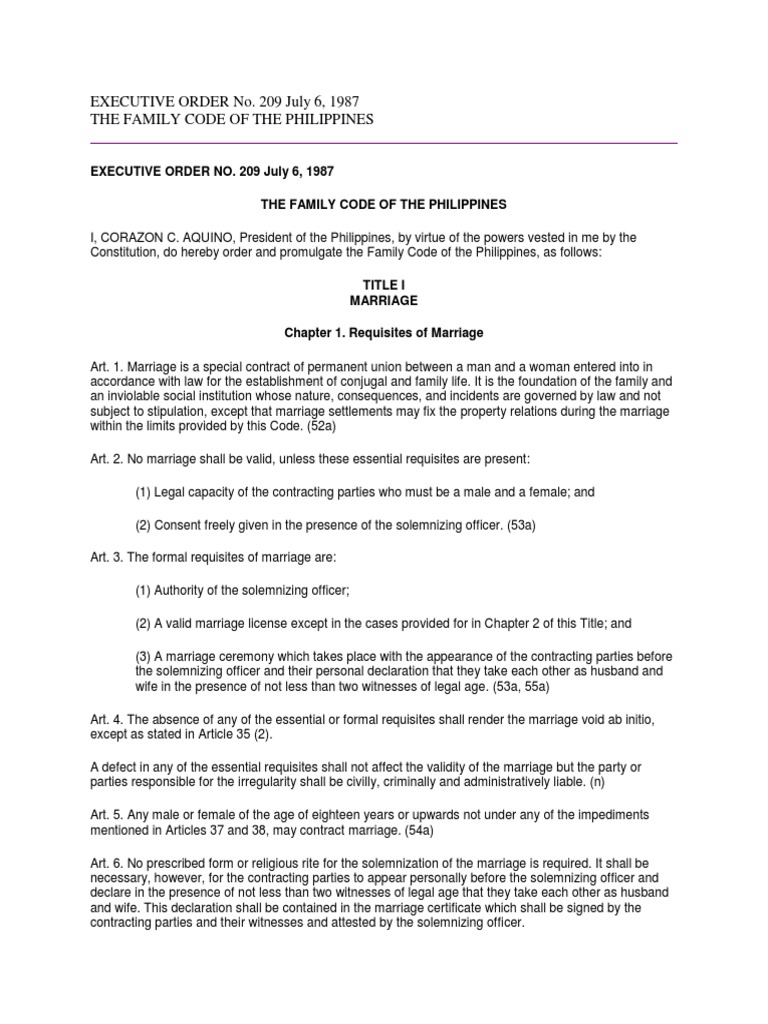 EXECUTIVE ORDER NO. 209 July 6, 1987 THE FAMILY CODE OF THE PHILIPPINES I, CORAZON C. AQUINO, President of the Philippines, by virtue of the powers vested in me by the Constitution, do hereby order and promulgate the Family Code of the Philippines, as follows: TITLE I MARRIAGE Chapter 1. Requisites of Marriage Art. 1. Marriage is a special contract of permanent union between a man and a woman entered into in accordance with law for the establishment of conjugal and family life. It is the foundation of the family and an inviolable social institution whose nature, consequences, and incidents are governed by law and not subject to stipulation, except that marriage settlements may fix the property relations during the marriage within the limits provided by this Code. (52a) Art. 2. No marriage shall be valid, unless these essential requisites are present: (1) Legal capacity of the contracting parties who must be a male and a female; and (2) Consent freely given in the presence of the solemnizing officer. (53a) Art. 3. The formal requisites of marriage are: (1) Authority of the solemnizing officer; (2) A valid marriage license except in the cases provided for in Chapter 2 of this Title; and (3) A marriage ceremony which takes place with the appearance of the contracting parties before the solemnizing officer and their personal declaration that they take each other as husband and wife in the presence of not less than two witnesses of legal age. (53a, 55a) Art. 4. The absence of any of the essential or formal requisites shall render the marriage void ab initio, except as stated in Article 35 (2). A defect in any of the essential requisites shall not affect the validity of the marriage but the party or parties responsible for the irregularity shall be civilly, criminally and administratively liable. (n) Art. 5. Any male or female of the age of eighteen years or upwards not under any of the impediments mentioned in Articles 37 and 38, may contract marriage. (54a) Art. 6. No prescribed form or religious rite for the solemnization of the marriage is required. It shall be necessary, however, for the contracting parties to appear personally before the solemnizing officer and declare in the presence of not less than two witnesses of legal age that they take each other as husband and wife. This declaration shall be contained in the marriage certificate which shall be signed by the contracting parties and their witnesses and attested by the solemnizing officer.