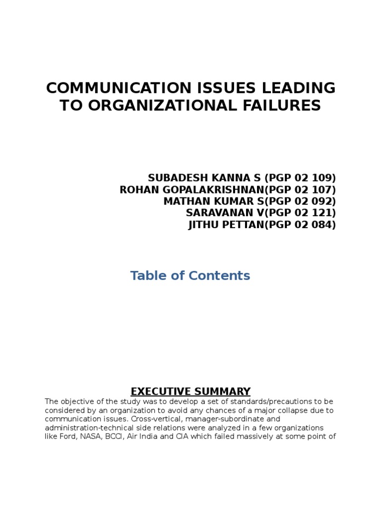 This project is aimed at analyzing a dozen such organizations which have failed due to communication issues across verticals, across organizations and between managers and sub-ordinates. For any successful project, all the departments have to work amicably in tandem to produce the desired results. The instructions and orders passed on from the top echelon of the organization should reach the targeted employees verbatim. Similarly, the feedback or issues reported by the lower levels of organization should have a proper medium or channel to find its way up the hierarchy to the management. But it doesnt always happen in reality. To understand various issues involved, several companies, over a long timespan, with unique communication problems pertaining to cross-vertical, crossorganizational and manager-subordinate relations have been chosen and analyzed. The best way to perfection is by learning from mistakes. That is why a near-comprehensive study of various communication issues which (almost) led to collapses of entire organizations has been done. Hence, the primary objective of this study is to develop a set of standards or precautions that have to be considered by any organization to obviate any chances of a colossal collapse.