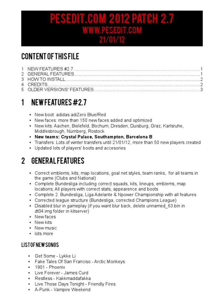 1. Delete the folder "kitserver" from the PES 2012main directory and also delete the start menu folder "PESEdit.com 2012 Patch" - skip this if this is the first time you install PESEdit.com 2012 Patch. 2. Install the patch using install.exe, make sure to choose the directory you installed PES 2012 to. 3. Start the game via pes2012.exe / start menu folder "PESEdit.com 2012 Patch" / PESEDIT SELECTOR