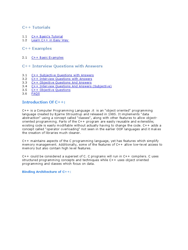 C++ is a Computer Programming Language .it is an "object oriented" programming language created by Bjarne Stroustrup and released in 1985. It implements "data abstraction" using a concept called "classes", along with other features to allow objectoriented programming. Parts of the C++ program are easily reusable and extensible; existing code is easily modifiable without actually having to change the code. C++ adds a concept called "operator overloading" not seen in the earlier OOP languages and it makes the creation of libraries much cleaner. C++ maintains aspects of the C programming language, yet has features which simplify memory management. Additionally, some of the features of C++ allow low-level access to memory but also contain high level features. C++ could be considered a superset of C. C programs will run in C++ compilers. C uses structured programming concepts and techniques while C++ uses object oriented programming and classes which focus on data. Binding Architecture of C++: