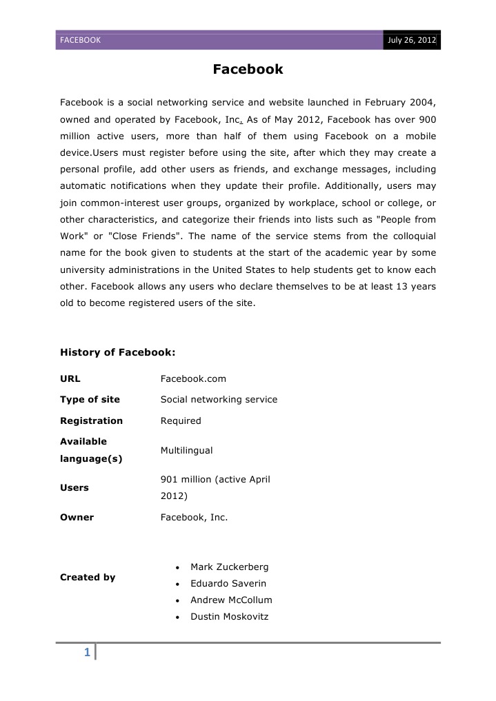 Facebook is a social networking service and website launched in February 2004, owned and operated by Facebook, Inc. As of May 2012, Facebook has over 900 million active users, more than half of them using Facebook on a mobile device.Users must register before using the site, after which they may create a personal profile, add other users as friends, and exchange messages, including automatic notifications when they update their profile. Additionally, users may join common-interest user groups, organized by workplace, school or college, or other characteristics, and categorize their friends into lists such as "People from Work" or "Close Friends". The name of the service stems from the colloquial name for the book given to students at the start of the academic year by some university administrations in the United States to help students get to know each other. Facebook allows any users who declare themselves to be at least 13 years old to become registered users of the site.