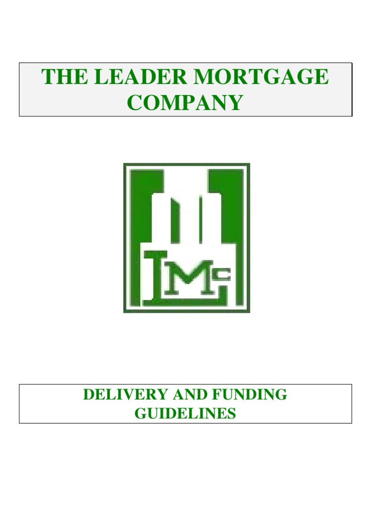 INTRODUCTION General Information The following instructions are applicable to FHA, VA, RD, and Conventional bond mortgage loans to be sold to The Leader Mortgage Company (TLMC). All loans will close in the name of the Originating Lenders. The mortgage loans must be readily marketable to prudent investors in the secondary mortgage market. In addition to these instructions, Originating Lenders must comply with individual loan conditions as set forth by the Department of HUD (FHA), the Department of Veterans Affairs (VA), the U.S. Dept of Agriculture (RHS or RD), Fannie Mae, FHLMC (Federal Home Loan Mortgage Corporation aka Freddie Mac), GNMA (Government National Mortgage Association aka Ginnie Mae), The Leader Mortgage Company, and all conditions as set forth in the bond origination documents Originating Lenders are responsible for full compliance with the Real Estate Settlement Procedures Act (RESPA), Federal Truth-in-Lending Law, and with supplying TLMC with the correct information to comply with the Home Mortgage Disclosure Act. (See Compliance Section). Originating Lenders will be responsible for the proper preparation and execution of all legal documents including but not limited to the closing statements, HUD-1 forms and Truth-in-Lending forms. A complete closed loan package must be received in fundable condition by the Program deadline date for delivery of the loan file for purchase. If the loan being delivered is seasoned (90 days old), the closing loan package must include the original recorded Security Instrument, final Title Policy, original recorded Assignment(s) of Mortgage, if applicable, evidence of insurance on FHA/VA loans, and the original LNG (Loan Note Guaranty RHS loans). The loan will not be considered eligible for purchase until these documents are provided. If the loan has exceptions, which prevent immediate purchase, you will receive an individual letter regarding the items/documents needed as well as a stated time to clear the exceptions. Weekly reports of all loans with exceptions will be faxed to the Originating Lender. Failure to clear loans for purchase within the stated timeframe may result in the assessment of penalties or the return of the loan file to your institution. . A. DELIVERY INSTRUCTIONS 1. Closed loan packages must be submitted in the legal sized file folder with all documentation acco fastened according to the appropriate Closed Loan Stacking Order Check sheet. The entire closed loan package should be reviewed for completeness and accuracy BEFORE shipping to TLMC. Loan packages must be sent via overnight delivery to the following address: 3