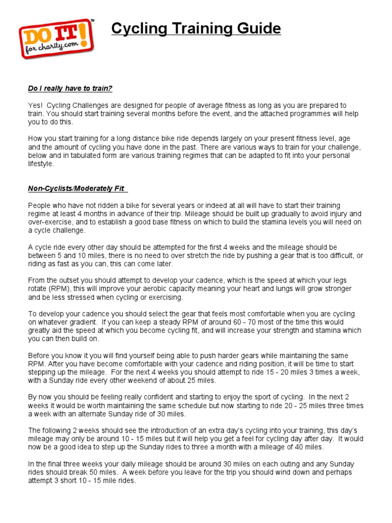 Cyclists/Moderately Fit This category might include anyone who has been cycling intermittently over the years, perhaps by cycling to work in the summer or regular Sunday rides with the family. As you will have a degree of basic fitness and confidence built up from previous cycling, 3 months or so of training should prepare you for the ride. The first 4 weeks should be spent introducing a regular programme into your training and concentrating on your cadence (as above), which will help develop your strength for the sustained ride. A mileage of 15 miles three times a week combined with alternate Sunday rides of 30 miles should be attempted for the first month. The second lot of 4 weeks should see you feeling stronger and confident to increase the mileage; your cadence should be fluent and comfortable, and the three rides a week should be covering about 25 miles each and the Sunday rides up to 40 miles. The penultimate 3 weeks should see the introduction of a fourth training ride every week, these four rides should be around 30 miles in length with three Sunday rides a month of 50 miles or more. You should by now be feeling comfortable with all these distances as long as you dont push yourself too hard. The final week should be spent winding down with three 10 - 15 mile rides and the confidence that you know you can complete and enjoy the 10-day ride ahead of you. Cyclists/Fit This category would include people who cycle regularly throughout the year whether it be commuting 20 miles or more to work a day or training seriously with weekend races and time trials. People within this category should already have a good training schedule and be amply fit to tackle a cycle challenge, though they should probably step up the training for long days riding. People included within the commuting bracket may find it a good idea to step their weekly mileage up by cycling a longer route to work, or doing a brief morning or evening ride and by also doing regular weekend rides of around 50 miles or more. Fitting training into your busy life The programmes attached are a rough training guide. Obviously with work, family and fundraising commitments you may not always be able to achieve what we have set out for you. However in order to get close to achieving the training it is very important to organise your time properly. There are plenty of ways to ensure that you maximise your training, even if you feel you have no time outside work.