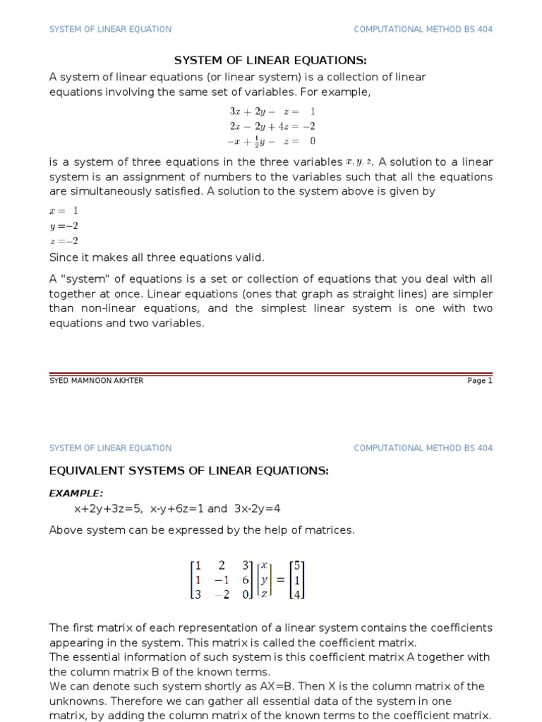 SYSTEM OF LINEAR EQUATIONS: A system of linear equations (or linear system) is a collection of linear equations involving the same set of variables. For example,