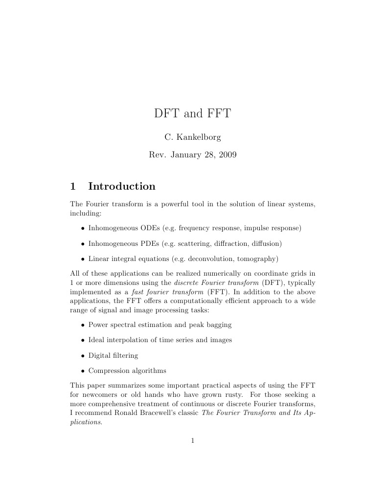 The Fourier transform is a powerful tool in the solution of linear systems, including: Inhomogeneous ODEs (e.g. frequency response, impulse response) Inhomogeneous PDEs (e.g. scattering, diraction, diusion) Linear integral equations (e.g. deconvolution, tomography) All of these applications can be realized numerically on coordinate grids in 1 or more dimensions using the discrete Fourier transform (DFT), typically implemented as a fast fourier transform (FFT). In addition to the above applications, the FFT oers a computationally ecient approach to a wide range of signal and image processing tasks: Power spectral estimation and peak bagging Ideal interpolation of time series and images Digital ltering Compression algorithms This paper summarizes some important practical aspects of using the FFT for newcomers or old hands who have grown rusty. For those seeking a more comprehensive treatment of continuous or discrete Fourier transforms, I recommend Ronald Bracewells classic The Fourier Transform and Its Applications. 1