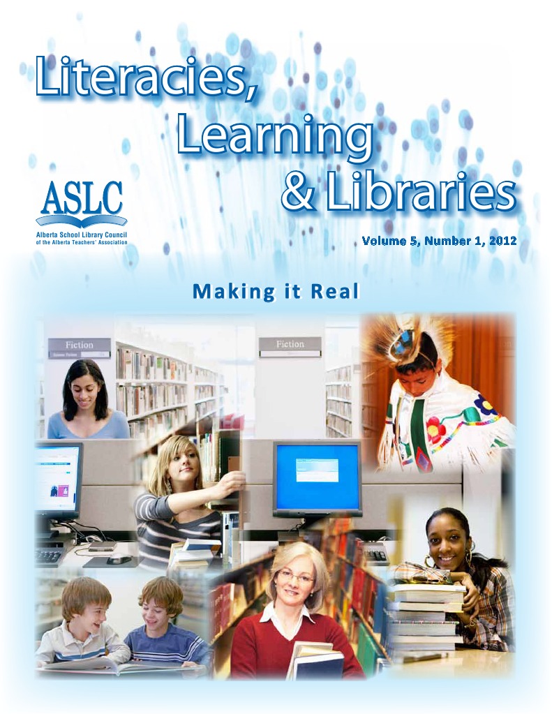 Copyright 2012 by The Alberta Teachers Association, 11010 142 Street NW, Edmonton, Alberta T5N 2R1. Unless otherwise indicated in the text, reproduction of material in Literacies, Learning & Libraries is authorized for classroom and professional development use, provided that each copy contain full acknowledgement of the source and that no charge be made beyond the cost of reprinting. Any other reproduction in whole or in part without prior written consent of the ATA is prohibited. Literacies, Learning & Libraries is published by the ATA for the ASLC. Although every effort is made to ensure accurate scholarship and responsible judgment, opinions expressed herein are not necessarily those of the ASLC or the ATA. Editorial and production services: Document Production staff, ATA. ISSN 1918-1779. Individual copies of this journal can be ordered at the following prices: 1 to 4 copies, $7.50 each; 5 to 10 copies, $5.00 each; over 10 copies, $3.50 each. Please add 5 per cent shipping and handling and 5 per cent GST. Please contact Distribution at Barnett House to place your order. In Edmonton, dial 780-447-9400, ext 321; toll free in Alberta, dial 1-800-232-7208, ext 321.