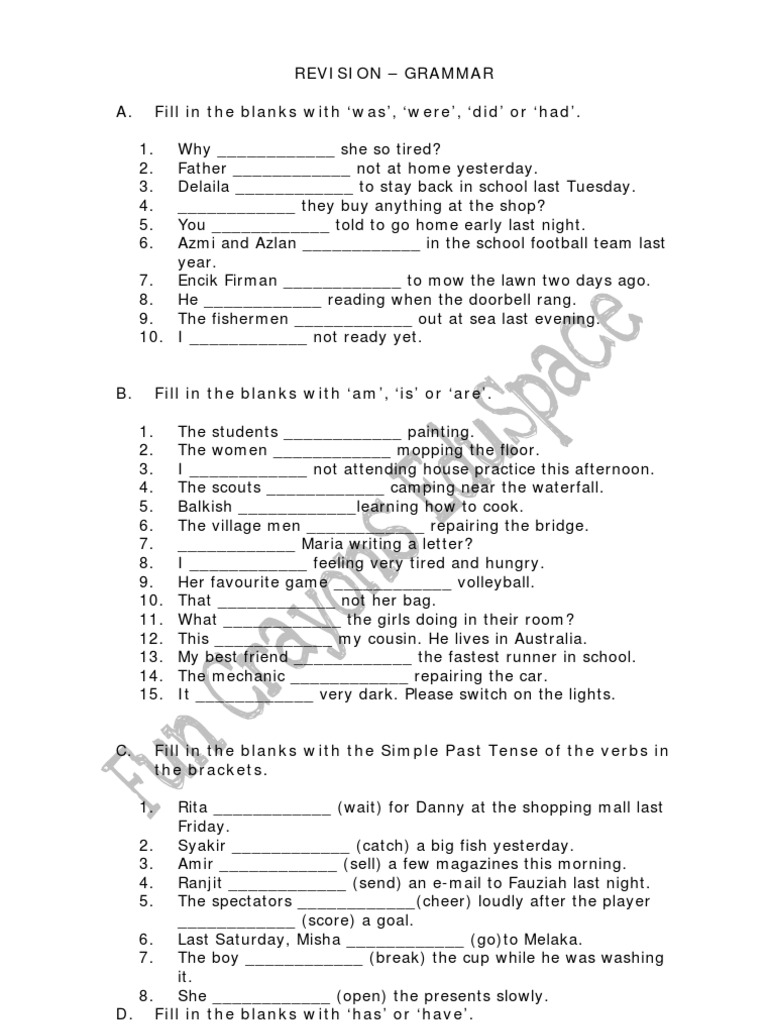 REVISION GRAMMAR A. Fill in the blanks with was, were, did or had. 1. 2. 3. 4. 5. 6. Why ____________ she so tired?