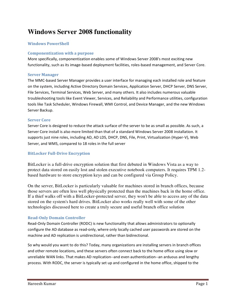 Network Access Protection Microsoft first planned to ship simple and easily configurable network quarantining functionality in Windows Server 2003, but it's here at last with Network Access Protection (NAP). This feature allows you to setup security policies for your network: When a client system connects, NAP examines the device to make sure it meets the requirements of your security policies. Those that do are allowed online. Those that do not--typically machines that only connect infrequently to the network, such as those used by travelling employees--are pushed aside into a quarantined part of the network, where they can be updated. How these updates happen depends on the configuration of your environment, but once that's complete, the system is given full access again and allowed back on the network. NAP includes remediation failback to Windows Update or Microsoft Update if the local Windows Server Hareesh Kumar Page 2
