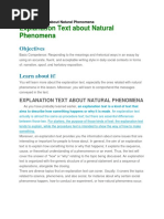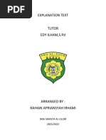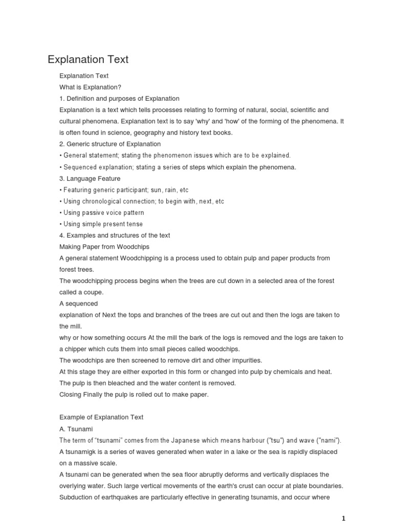 Explanation Text What is Explanation? 1. Definition and purposes of Explanation Explanation is a text which tells processes relating to forming of natural, social, scientific and cultural phenomena. Explanation text is to say 'why' and 'how' of the forming of the phenomena. It is often found in science, geography and history text books. 2. Generic structure of Explanation General statement; stating the phenomenon issues which are to be explained. Sequenced explanation; stating a series of steps which explain the phenomena. 3. Language Feature Featuring generic participant; sun, rain, etc Using chronological connection; to begin with, next, etc Using passive voice pattern Using simple present tense 4. Examples and structures of the text Making Paper from Woodchips A general statement Woodchipping is a process used to obtain pulp and paper products from forest trees. The woodchipping process begins when the trees are cut down in a selected area of the forest called a coupe. A sequenced explanation of Next the tops and branches of the trees are cut out and then the logs are taken to the mill. why or how something occurs At the mill the bark of the logs is removed and the logs are taken to a chipper which cuts them into small pieces called woodchips. The woodchips are then screened to remove dirt and other impurities. At this stage they are either exported in this form or changed into pulp by chemicals and heat. The pulp is then bleached and the water content is removed. Closing Finally the pulp is rolled out to make paper.