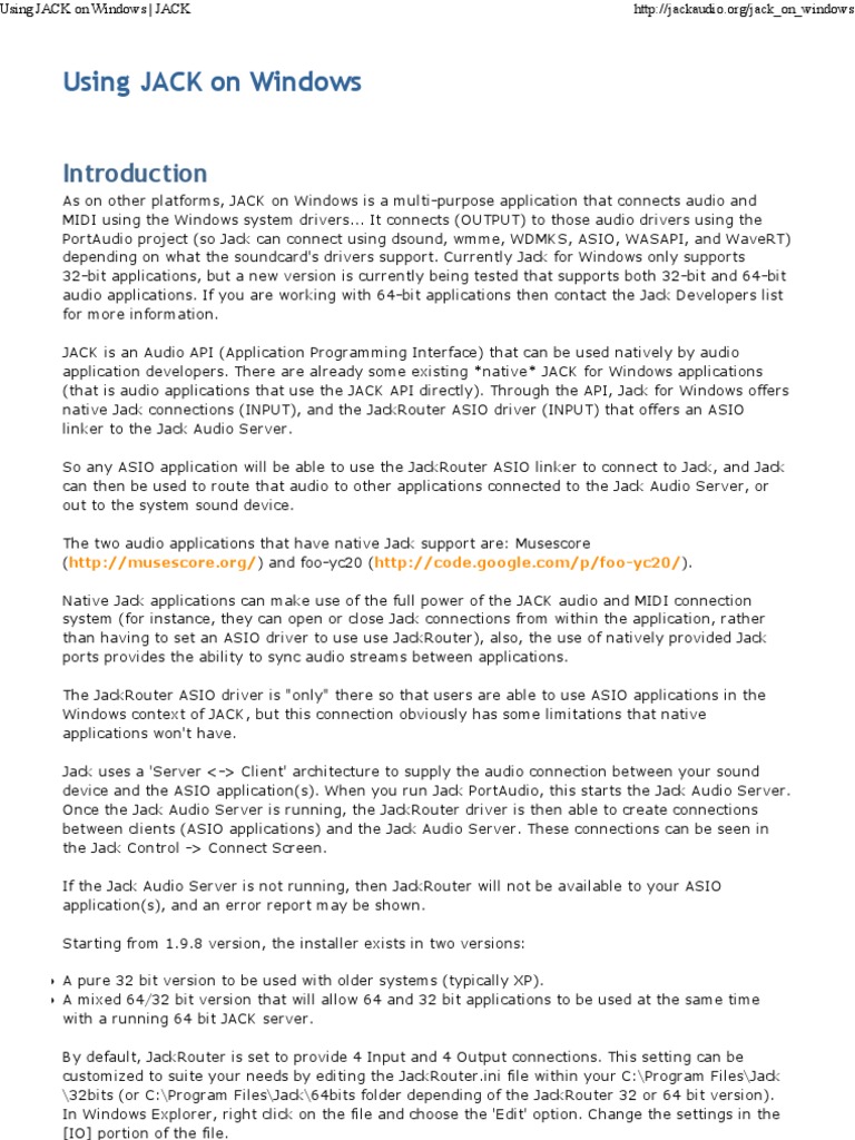As on other platforms, JACK on Windows is a multi-purpose application that connects audio and MIDI using the Windows system drivers... It connects (OUTPUT) to those audio drivers using the PortAudio project (so Jack can connect using dsound, wmme, WDMKS, ASIO, WASAPI, and WaveRT) depending on what the soundcard's drivers support. Currently Jack for Windows only supports 32-bit applications, but a new version is currently being tested that supports both 32-bit and 64-bit audio applications. If you are working with 64-bit applications then contact the Jack Developers list for more information. JACK is an Audio API (Application Programming Interface) that can be used natively by audio application developers. There are already some existing *native* JACK for Windows applications (that is audio applications that use the JACK API directly). Through the API, Jack for Windows offers native Jack connections (INPUT), and the JackRouter ASIO driver (INPUT) that offers an ASIO linker to the Jack Audio Server. So any ASIO application will be able to use the JackRouter ASIO linker to connect to Jack, and Jack can then be used to route that audio to other applications connected to the Jack Audio Server, or out to the system sound device. The two audio applications that have native Jack support are: Musescore (http://musescore.org/) and foo-yc20 (http://code.google.com/p/foo-yc20/). Native Jack applications can make use of the full power of the JACK audio and MIDI connection system (for instance, they can open or close Jack connections from within the application, rather than having to set an ASIO driver to use use JackRouter), also, the use of natively provided Jack ports provides the ability to sync audio streams between applications. The JackRouter ASIO driver is "only" there so that users are able to use ASIO applications in the Windows context of JACK, but this connection obviously has some limitations that native applications won't have. Jack uses a 'Server <-> Client' architecture to supply the audio connection between your sound device and the ASIO application(s). When you run Jack PortAudio, this starts the Jack Audio Server. Once the Jack Audio Server is running, the JackRouter driver is then able to create connections between clients (ASIO applications) and the Jack Audio Server. These connections can be seen in the Jack Control -> Connect Screen. If the Jack Audio Server is not running, then JackRouter will not be available to your ASIO application(s), and an error report may be shown. Starting from 1.9.8 version, the installer exists in two versions: A pure 32 bit version to be used with older systems (typically XP). A mixed 64/32 bit version that will allow 64 and 32 bit applications to be used at the same time with a running 64 bit JACK server. By default, JackRouter is set to provide 4 Input and 4 Output connections. This setting can be customized to suite your needs by editing the JackRouter.ini file within your C:\Program Files\Jack \32bits (or C:\Program Files\Jack\64bits folder depending of the JackRouter 32 or 64 bit version). In Windows Explorer, right click on the file and choose the 'Edit' option. Change the settings in the [IO] portion of the file.