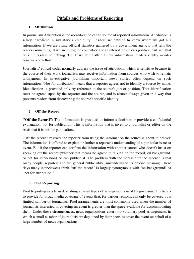 1. Attribution In journalism Attribution is the identification of the source of reported information. Attribution is a key ingredient in any storys credibility. Readers are entitled to know where we got our information. If we are citing official statistics gathered by a government agency, that tells the readers something. If we are citing the contentions of an interest group or a political partisan, that tells the readers something else. If we dont attribute our information, readers rightly wonder how we know that. Journalists' ethical codes normally address the issue of attribution, which is sensitive because in the course of their work journalists may receive information from sources who wish to remain anonymous. In investigative journalism important news stories often depend on such information. "Not for attribution" means that a reporter agrees not to identify a source by name. Identification is provided only by reference to the source's job or position. That identification must be agreed upon by the reporter and the source, and is almost always given in a way that prevents readers from discovering the source's specific identity. 2. Off the Record "Off-the-Record": The information is provided to inform a decision or provide a confidential explanation, not for publication. This is information that is given to a journalist or editor on the basis that it is not for publication. "Off the record" restricts the reporter from using the information the source is about to deliver. The information is offered to explain or further a reporter's understanding of a particular issue or event. But if the reporter can confirm the information with another source who doesn't insist on speaking off the record (whether that means he agreed to talking on the record, on background, or not for attribution) he can publish it. The problem with the phrase "off the record" is that many people, reporters and the general public alike, misunderstand its precise meaning. These days many interviewees think "off the record" is largely synonymous with "on background" or "not for attribution." 3. Pool Reporting Pool Reporting is a term describing several types of arrangements used by government officials to provide for broad media coverage of events that, for various reasons, can only be covered by a limited number of journalists. Pool arrangements are most commonly used when the number of journalists interested in covering an event is greater than the space available for accommodating them. Under these circumstances, news organizations enter into voluntary pool arrangements in which a small number of journalists are deputized by their peers to cover the event on behalf of a large number of news organizations.