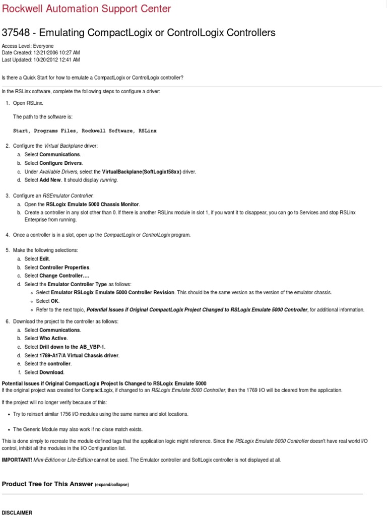Rockwell Automation Support Center 37548 - Emulating CompactLogix or ControlLogix Controllers