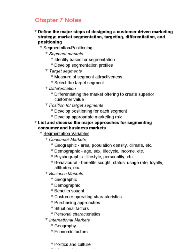 Dene the major steps of designing a customer driven marketing strategy: market segmentation, targeting, differentiation, and positioning Segmentation/Positioning Segment markets Identify bases for segmentation Develop segmentation proles Target segments Measure of segment attractiveness Select the target segment Differentiation Differentiating the market offering to create superior customer value Position for target segments Develop positioning for each segment Develop appropriate marketing mix List and discuss the major approaches for segmenting consumer and business markets Segmentation Variables Consumer Markets Geographic - area, population density, climate, etc. Demographic - age, sex, lifecycle, income, etc. Psychographic - lifestyle, personality, etc. Behavioural - benets sought, status, usage rate, loyalty, attitudes, etc. Business Markets Geographic Demographic Benets sought Customer operating characteristics Purchasing approaches Situational factors Personal characteristics International Markets Geography Economic factors