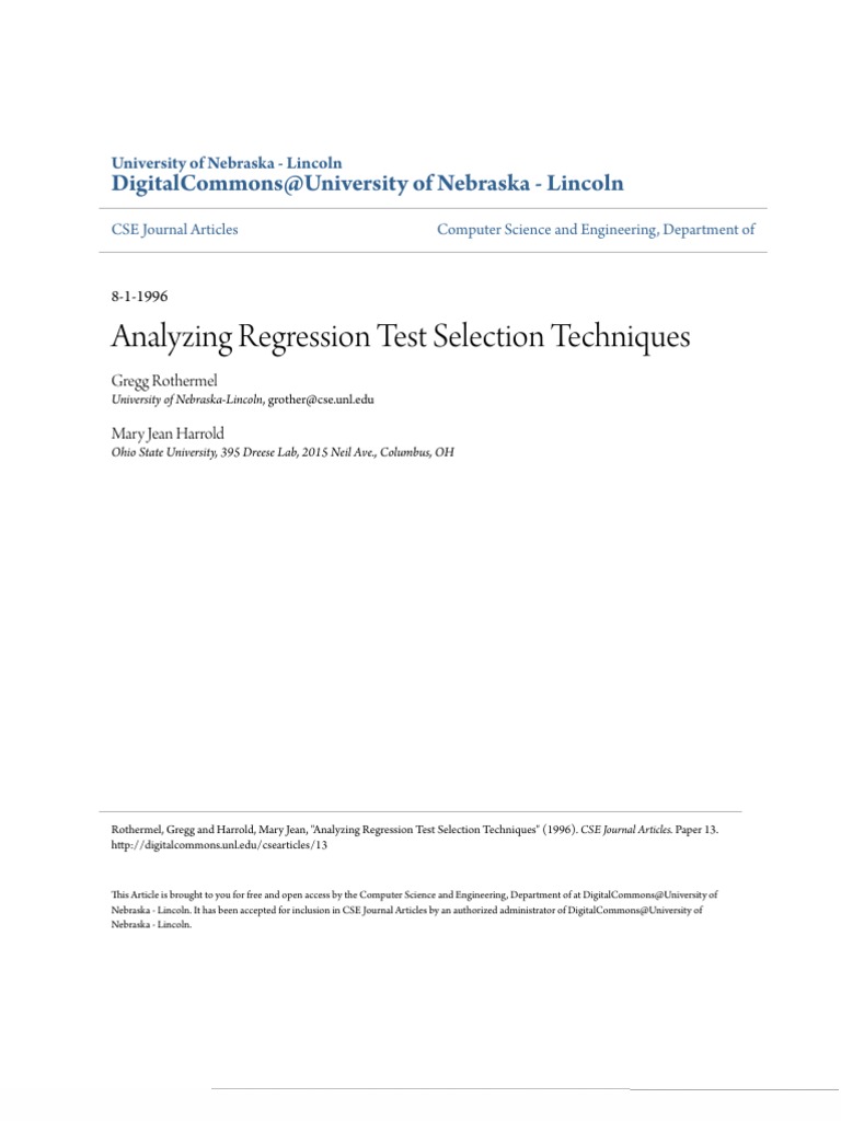 Rothermel, Gregg and Harrold, Mary Jean, "Analyzing Regression Test Selection Techniques" (1996). CSE Journal Articles. Paper 13. http://digitalcommons.unl.edu/csearticles/13