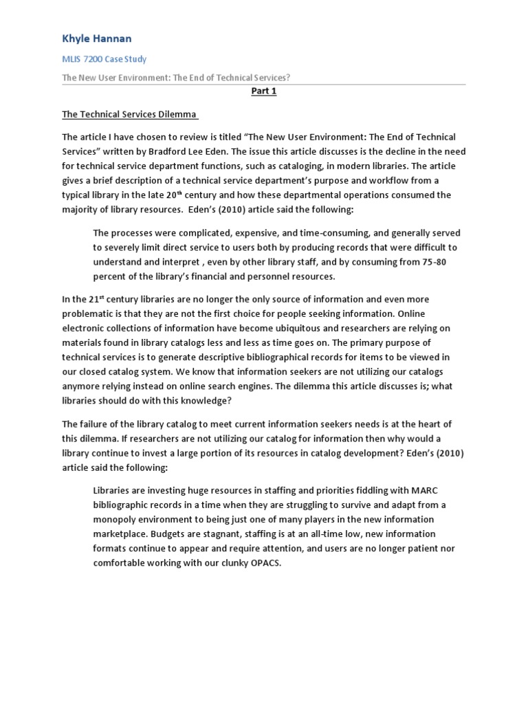 Part 1 The Technical Services Dilemma The article I have chosen to review is titled The New User Environment: The End of Technical Services written by Bradford Lee Eden. The issue this article discusses is the decline in the need for technical service department functions, such as cataloging, in modern libraries. The article gives a brief description of a technical service departments purpose and workflow from a typical library in the late 20th century and how these departmental operations consumed the majority of library resources. Edens (2010) article said the following: The processes were complicated, expensive, and time-consuming, and generally served to severely limit direct service to users both by producing records that were difficult to understand and interpret , even by other library staff, and by consuming from 75-80 percent of the librarys financial and personnel resources. In the 21st century libraries are no longer the only source of information and even more problematic is that they are not the first choice for people seeking information. Online electronic collections of information have become ubiquitous and researchers are relying on materials found in library catalogs less and less as time goes on. The primary purpose of technical services is to generate descriptive bibliographical records for items to be viewed in our closed catalog system. We know that information seekers are not utilizing our catalogs anymore relying instead on online search engines. The dilemma this article discusses is; what libraries should do with this knowledge? The failure of the library catalog to meet current information seekers needs is at the heart of this dilemma. If researchers are not utilizing our catalog for information then why would a library continue to invest a large portion of its resources in catalog development? Edens (2010) article said the following: Libraries are investing huge resources in staffing and priorities fiddling with MARC bibliographic records in a time when they are struggling to survive and adapt from a monopoly environment to being just one of many players in the new information marketplace. Budgets are stagnant, staffing is at an all-time low, new information formats continue to appear and require attention, and users are no longer patient nor comfortable working with our clunky OPACS.