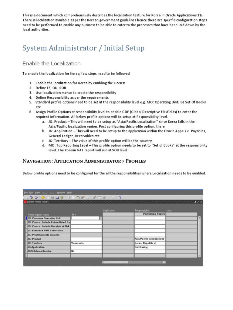 To enable the localization for Korea, few steps need to be followed 1. 2. 3. 4. 5. Enable the localization for Korea by enabling the License Define LE, OU, SOB Use localization menus to create the responsibility Define Responsibility as per the requirements Standard profile options need to be set at the responsibility level e.g. MO: Operating Unit, GL Set Of Books etc. 6. Assign Profile Options at responsibility level to enable GDF (Global Descriptive Flexfields) to enter the required information. All below profile options will be setup at Responsibility level. a. JG: Product This will need to be setup as Asia/Pacific Localization since Korea falls in the Asia/Pacific localization region. Post configuring this profile option, there b. JG: Application This will need to be setup to the application within the Oracle Apps. i.e. Payables, General Ledger, Receivables etc. c. JG: Territory The value of this profile option will be the country. d. MO: Top Reporting Level This profile option needs to be set to Set of Books at the responsibility level. The Korean VAT report will run at SOB level.
