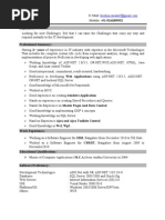 Excellent interpersonal analytical, logical and programming skills. Committed to highest levels of professional and personal excellence TECHNICAL EXPERIENCE Languages : C#.NET , UML, HTML,XHTML,XML Web Technologies : ASP.NET,PHP Database : SQL Server 2005 Scripting : ASP,PHP Methodologies : OOAD, SDLC. Operating Systems: Windows 2000/XP Data Access: ADO.NET, ADO.NET Entity Framework, ODBC Certifications Microsoft Certified Professional Key Achievements E seva-Gradient technologies Ltd India-2006 to 2007 A world class website useful for each and every buyer consumer who wants to get Information regarding products or services offered by local vendors or vendors of the whole world, Irrespective of the size and nature of the requirement, place of requirement, nature of product and Services, type of business houses, place of business. User-Interface - designed flow charts, coded W3C compliant XHTML and CSS code for all pages. Go for gift -Gradient technologies Ltd India-2006 to 2007 Goforgift.com is web based gifting service for non resident Indians all over the world. The site offers exclusive collection and genuine quality at the lowest prices. It's economical, fast, friendly and trouble free. Developed this dynamic website using PHP/mySQL, incorporated JavaScript client-side scripting implemented Search Engine Optimization strategies Rampant yak University of Stirling Rampant yak is web based system allowing the user to edit the schedules. The Rampant yak website is divided into two modules Administrative web based interface General users of the Rampant yak website The whole website is developed using scripting language like PHP and database mySQL. User-Interface - designed flow charts, coded W3C compliant XHTML and CSS code for all pages.