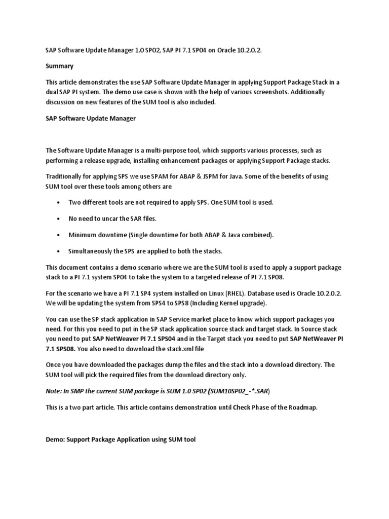 Summary This article demonstrates the use SAP Software Update Manager in applying Support Package Stack in a dual SAP PI system. The demo use case is shown with the help of various screenshots. Additionally discussion on new features of the SUM tool is also included. SAP Software Update Manager