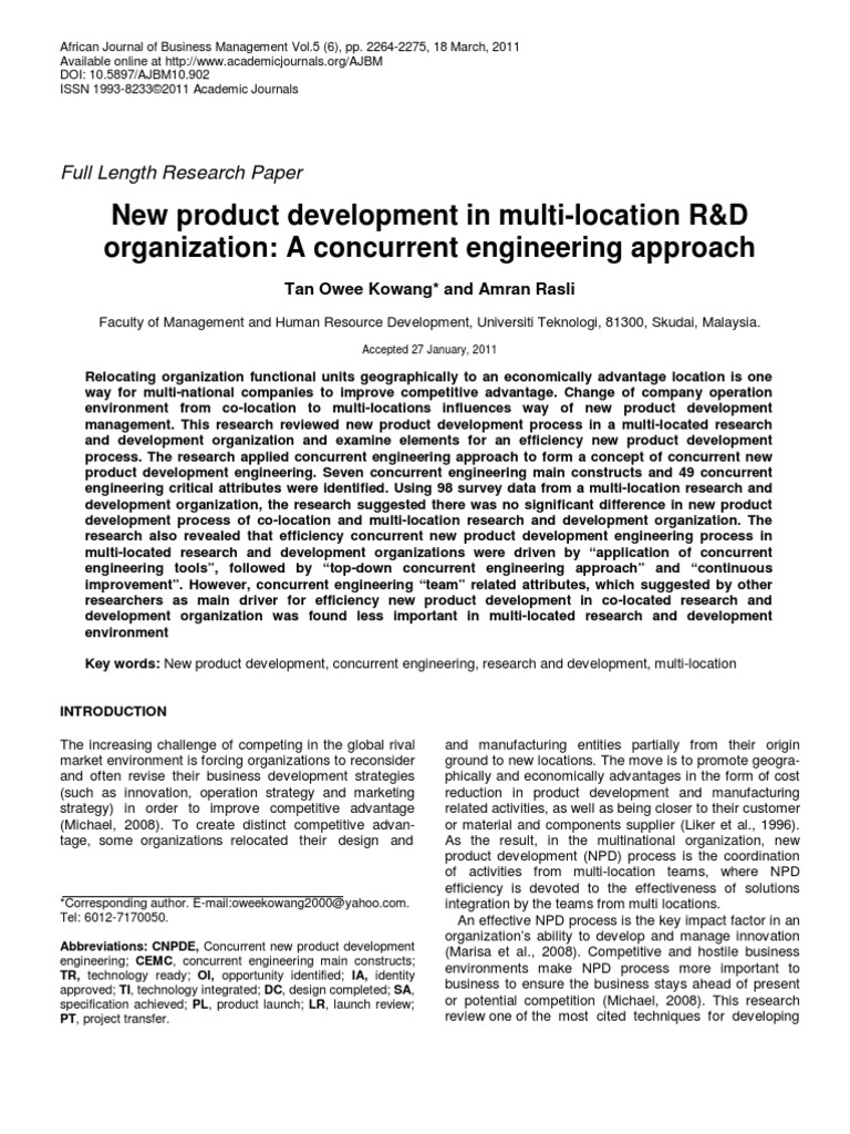 Relocating organization functional units geographically to an economically advantage location is one way for multi-national companies to improve competitive advantage. Change of company operation environment from co-location to multi-locations influences way of new product development management. This research reviewed new product development process in a multi-located research and development organization and examine elements for an efficiency new product development process. The research applied concurrent engineering approach to form a concept of concurrent new product development engineering. Seven concurrent engineering main constructs and 49 concurrent engineering critical attributes were identified. Using 98 survey data from a multi-location research and development organization, the research suggested there was no significant difference in new product development process of co-location and multi-location research and development organization. The research also revealed that efficiency concurrent new product development engineering process in multi-located research and development organizations were driven by application of concurrent engineering tools, followed by top-down concurrent engineering approach and continuous improvement. However, concurrent engineering team related attributes, which suggested by other researchers as main driver for efficiency new product development in co-located research and development organization was found less important in multi-located research and development environment Key words: New product development, concurrent engineering, research and development, multi-location INTRODUCTION The increasing challenge of competing in the global rival market environment is forcing organizations to reconsider and often revise their business development strategies (such as innovation, operation strategy and marketing strategy) in order to improve competitive advantage (Michael, 2008). To create distinct competitive advantage, some organizations relocated their design and and manufacturing entities partially from their origin ground to new locations. The move is to promote geographically and economically advantages in the form of cost reduction in product development and manufacturing related activities, as well as being closer to their customer or material and components supplier (Liker et al., 1996). As the result, in the multinational organization, new product development (NPD) process is the coordination of activities from multi-location teams, where NPD efficiency is devoted to the effectiveness of solutions integration by the teams from multi locations. An effective NPD process is the key impact factor in an organizations ability to develop and manage innovation (Marisa et al., 2008). Competitive and hostile business environments make NPD process more important to business to ensure the business stays ahead of present or potential competition (Michael, 2008). This research review one of the most cited techniques for developing