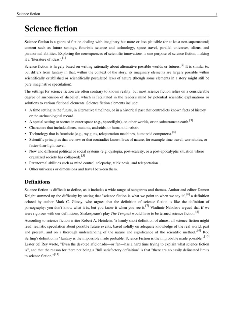Science fiction is a genre of fiction dealing with imaginary but more or less plausible (or at least non-supernatural) content such as future settings, futuristic science and technology, space travel, parallel universes, aliens, and paranormal abilities. Exploring the consequences of scientific innovations is one purpose of science fiction, making it a "literature of ideas".[1] Science fiction is largely based on writing rationally about alternative possible worlds or futures.[2] It is similar to, but differs from fantasy in that, within the context of the story, its imaginary elements are largely possible within scientifically established or scientifically postulated laws of nature (though some elements in a story might still be pure imaginative speculation). The settings for science fiction are often contrary to known reality, but most science fiction relies on a considerable degree of suspension of disbelief, which is facilitated in the reader's mind by potential scientific explanations or solutions to various fictional elements. Science fiction elements include: A time setting in the future, in alternative timelines, or in a historical past that contradicts known facts of history or the archaeological record. A spatial setting or scenes in outer space (e.g., spaceflight), on other worlds, or on subterranean earth.[3] Characters that include aliens, mutants, androids, or humanoid robots. Technology that is futuristic (e.g., ray guns, teleportation machines, humanoid computers).[4] Scientific principles that are new or that contradict known laws of nature, for example time travel, wormholes, or faster-than-light travel. New and different political or social systems (e.g. dystopia, post-scarcity, or a post-apocalyptic situation where organized society has collapsed).[5] Paranormal abilities such as mind control, telepathy, telekinesis, and teleportation. Other universes or dimensions and travel between them.