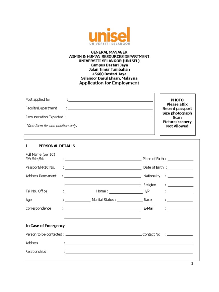 GENERAL MANAGER ADMIN & HUMAN RESOURCES DEPARTMENT UNIVERSITI SELANGOR (UNISEL) Kampus Bestari Jaya Jalan Timur