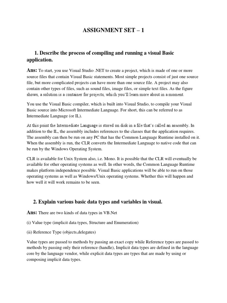 1. Describe the process of compiling and running a visual Basic application. Ans: To start, you use Visual Studio .NET to create a project, which is made of one or more