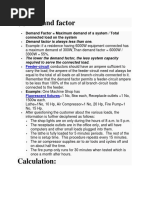 termed the maximum demand of the feeder. The sum of the maximum demand loads for a number of sub feeders divided by the diversity factor for the sub feeders will give the maximum demand load to be supplied by the feeder from which the sub feeders are derived. Example-1: Suppose We have four individual feeder-circuits with connected loads of 250 kVA, 200 kVA, 150 kVA and 400 kVA and demand factors of 90%, 80%, 75% and 85% respectively.Use a diversity factor of 1.5. Calculating demand for feeder-circuits o 250 kVA x 90% = 225 kVA o 200 kVA x 80% = 160 kVA o 150 kVA x 75% = 112.5 kVA o 400 kVA x 85% = 340 kVA o 837.5 kVA o The sum of the individual demands is equal to 837.5 kVA. o If the main feeder-circuit were sized at unity diversity: kVA = 837.5 kVA 1.00 = 837.5 kVA. o The main feeder-circuit would have to be supplied by an 850 kVA transformer. o However, using the diversity factor of 1.5, the kVA = 837.5 kVA 1.5 = 558 kVA for the main feeder. o For diversity factor of 1.5, a 600 kVA transformer could be used. o Example-2: A conveyor belt made up of six sections, each driven by a 2 kW motor. As material is transported along this belt, it is first carried by section 1, and then each section in succession until the final section is reached. In this simple example only one section of conveyor is carrying material at any point in time. Therefore five motors are only handling no-load mechanical losses (say .1 kW) keeping the belts moving whilst one motor is handling the load (say 1 kW). The demand presented by each motor when it is carrying its load is 1 kW, the sum of the demand loads is 6 kW but the maximum load presented by the system at any time is only 1.5 kW. o Diversity factor =Sum of Individual Max. Demand / Max. Demand = 6 Kw / 1.5 Kw =4. o Demand Factor = Maximum demand / Total connected load = 1.5 Kw / 12 Kw = 0.125.