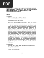 Thus the allonge was inconsistent with the assignment and contradicted the allegation in the complaint that HSBC was the holder of the note Furthermore, the affidavits filed by HSBC did not explain the relationship between HSBC and Bishops Gate Residential Mortgage Trust, nor otherwise aver facts conclusively showing that HSBC was the holder of the note. Rigby v. Wells Fargo, N.A., __So.3d__, 2012 WL1108428 (Fla. 4th DCA 2012) Trust: Option One Mortgage Loan Trust 2007-FXD2 Mortgage Amount: $165,600 The Bank has not shown that it was holder of the note at the time the complaint was filed. The note containing a special endorsement in favor of the bank was not dated. The assignment of mortgage, dated May 22, 2008, indicates that Bank did not acquire the mortgage until the day after the complaint was filed. Finally, neither the affidavit, nor the technical admissions made by the Rigbys, establishes the date on which Bank acquired possession of the note and there is no evidence in the record establishing that an equitable transfer of the mortgage occurred prior to the date the complaint was filed. (Summary judgment reversed and remanded.) Servedio v. U.S. Bank, N.A., 46 So. 3d 1105 (Fla. 4th DCA 2010) Trust: Terwin Mortgage Trust 2007-AHL1 Mortgage Amount: $252,000 The issue presented in this appeal is whether the trial court erred in granting a final summary judgment