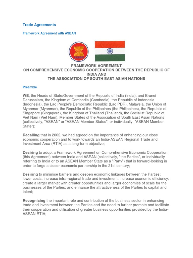 WE, the Heads of State/Government of the Republic of India (India), and Brunei Darussalam, the Kingdom of Cambodia (Cambodia), the Republic of Indonesia (Indonesia), the Lao People's Democratic Republic (Lao PDR), Malaysia, the Union of Myanmar (Myanmar), the Republic of the Philippines (the Philippines), the Republic of Singapore (Singapore), the Kingdom of Thailand (Thailand), the Socialist Republic of Viet Nam (Viet Nam), Member States of the Association of South East Asian Nations (collectively, "ASEAN" or "ASEAN Member States", or individually, "ASEAN Member State"); Recalling that in 2002, we had agreed on the importance of enhancing our close economic cooperation and to work towards an India-ASEAN Regional Trade and Investment Area (RTIA) as a long-term objective; Desiring to adopt a Framework Agreement on Comprehensive Economic Cooperation (this Agreement) between India and ASEAN (collectively, "the Parties", or individually referring to India or to an ASEAN Member State as a "Party") that is forward-looking in order to forge a closer economic partnership in the 21st century; Desiring to minimise barriers and deepen economic linkages between the Parties; lower costs; increase intra-regional trade and investment; increase economic efficiency; create a larger market with greater opportunities and larger economies of scale for the businesses of the Parties; and enhance the attractiveness of the Parties to capital and talent; Recognising the important role and contribution of the business sector in enhancing trade and investment between the Parties and the need to further promote and facilitate their cooperation and utilisation of greater business opportunities provided by the IndiaASEAN RTIA;