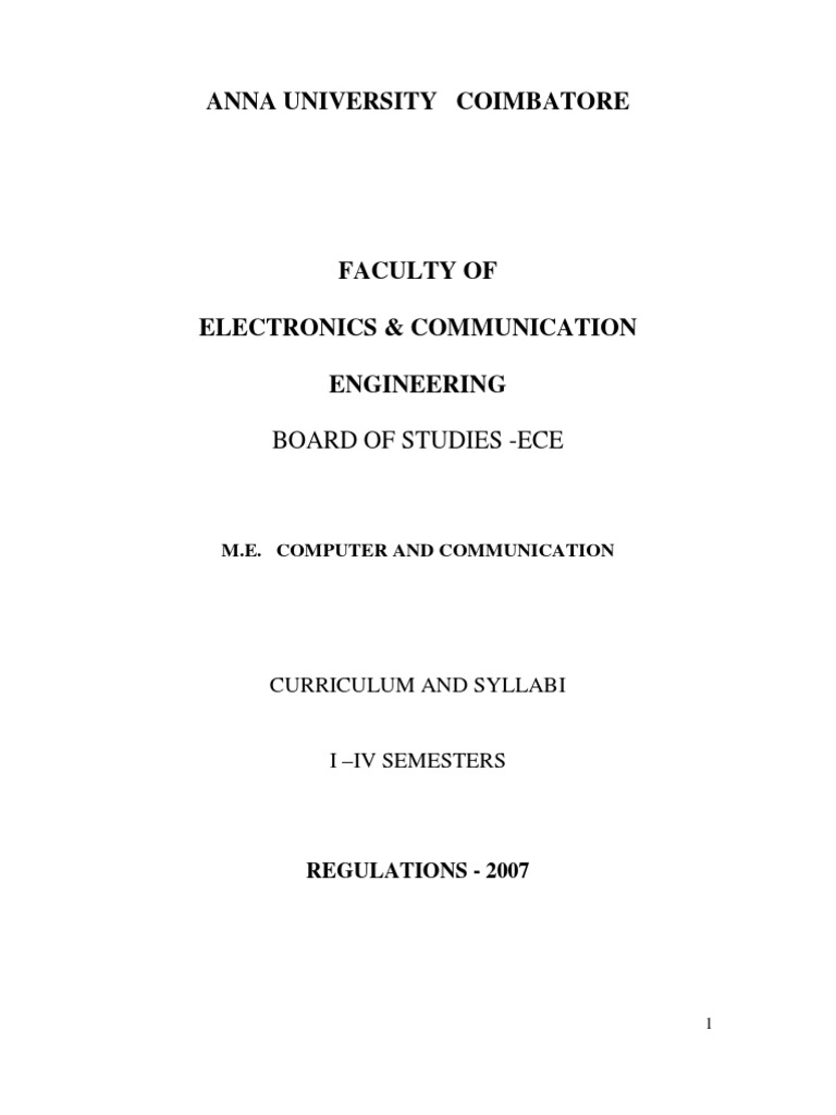 ANNA UNIVERSITY COIMBATORE M.E. COMPUTER AND COMMUNICATION CURRICULUM 2007 - FULL TIME MODE SEMESTER I Code No. Theory 07CP101 07CP102 07CP103 07CP104 07CP105 07CP106 Practical 07CP107 Course Title Applied Mathematics Advanced Digital Signal Processing Modern Digital Communication Techniques Data communication Networks Object Oriented Software Development System Programming and Operating System Computer and Communication Lab I Total SEMESTER II Code No. Theory 0 7CP201 0 7CP202 0 7CP203 0 7CP2XX 0 7CP2XX 0 7CP2XX Practical 0 7CP204 Course Title High Speed Networks Optical Fiber Communication Computer Architecture and Parallel Computing Elective I Elective II Elective III Computer and Communication Lab II Total L 3 3 3 3 3 3 0 18 T 1 0 0 1 0 0 0 2 P 0 0 0 0 0 0 4 4 M 100 100 100 100 100 100 100 L 3 3 3 3 3 3 0 18 T 1 0 0 1 0 0 0 2 P 0 0 0 0 0 0 4 4 M 100 100 100 100 100 100 100 -