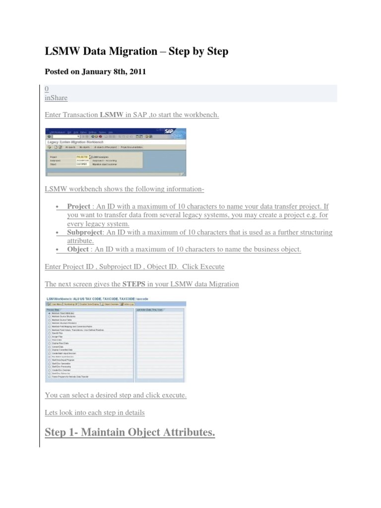 Enter Project ID , Subproject ID , Object ID. Click Execute The next screen gives the STEPS in your LSMW data Migration
