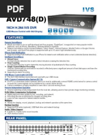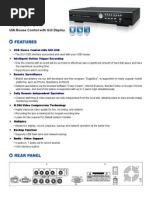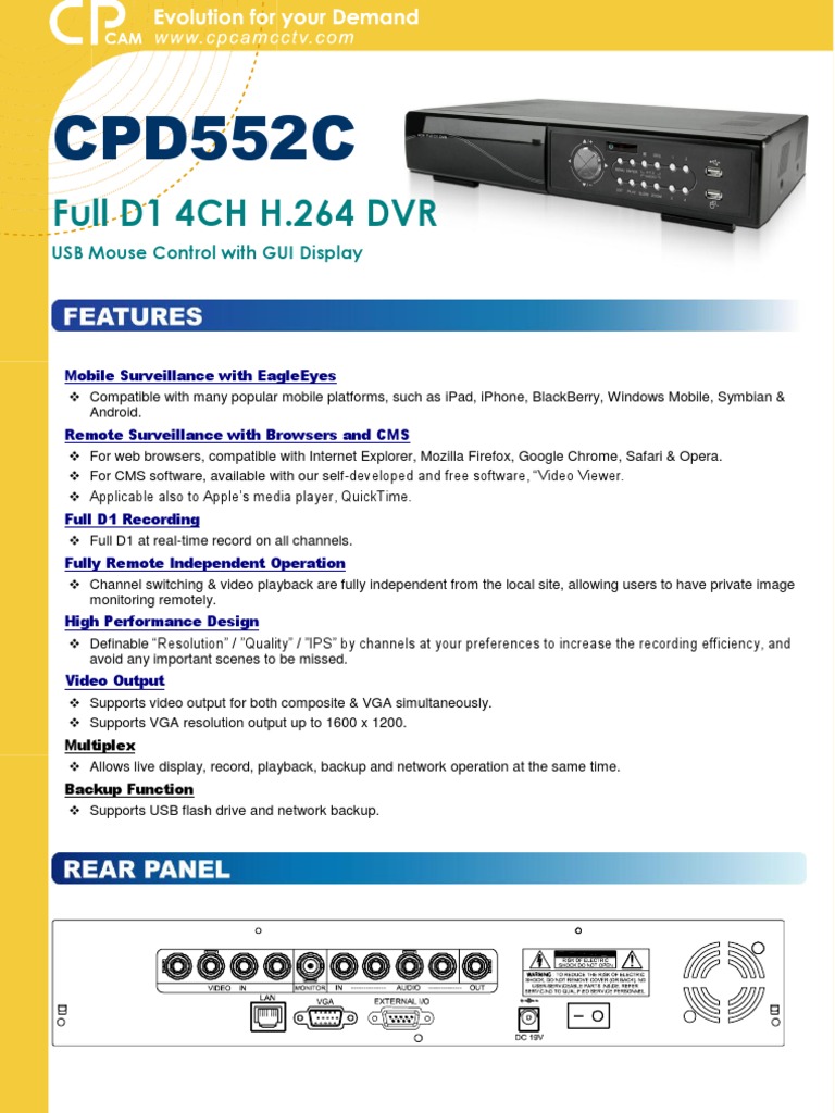 Mobile Surveillance with EagleEyes Compatible with many popular mobile platforms, such as iPad, iPhone, BlackBerry, Windows Mobile, Symbian & Android. Remote Surveillance with Browsers and CMS For web browsers, compatible with Internet Explorer, Mozilla Firefox, Google Chrome, Safari & Opera. For CMS software, available with our self-developed and free software, Video Viewer. Applicable also to Apples media player, QuickTime. Full D1 Recording Full D1 at real-time record on all channels. Fully Remote Independent Operation Channel switching & video playback are fully independent from the local site, allowing users to have private image monitoring remotely. High Performance Design Definable Resolution / Quality / IPS by channels at your preferences to increase the recording efficiency, and avoid any important scenes to be missed. Video Output Supports video output for both composite & VGA simultaneously. Supports VGA resolution output up to 1600 x 1200. Multiplex Allows live display, record, playback, backup and network operation at the same time. Backup Function Supports USB flash drive and network backup.