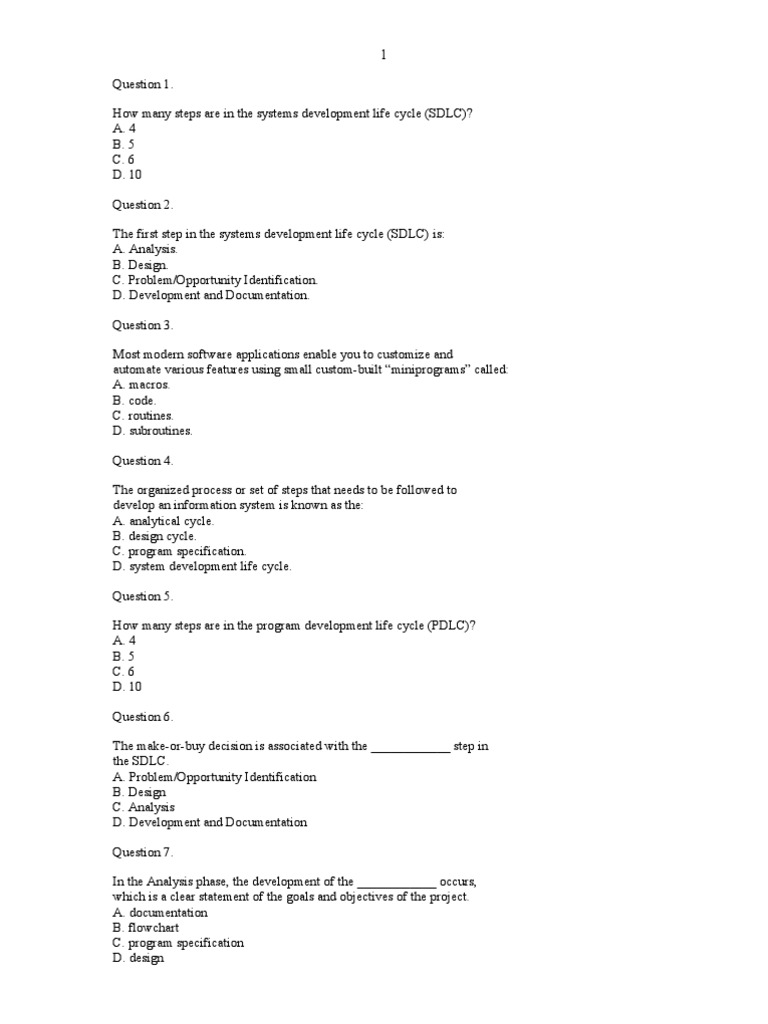 Question 1. How many steps are in the systems development life cycle (SDLC)? A. 4 B. 5 C. 6 D. 10 Question 2. The first step in the systems development life cycle (SDLC) is: A. Analysis. B. Design. C. Problem/Opportunity Identification. D. Development and Documentation. Question 3. Most modern software applications enable you to customize and automate various features using small custom-built miniprograms called: A. macros. B. code. C. routines. D. subroutines. Question 4. The organized process or set of steps that needs to be followed to develop an information system is known as the: A. analytical cycle. B. design cycle. C. program specification. D. system development life cycle. Question 5. How many steps are in the program development life cycle (PDLC)? A. 4 B. 5 C. 6 D. 10 Question 6. The make-or-buy decision is associated with the ____________ step in the SDLC. A. Problem/Opportunity Identification B. Design C. Analysis D. Development and Documentation Question 7. In the Analysis phase, the development of the ____________ occurs, which is a clear statement of the goals and objectives of the project. A. documentation B. flowchart C. program specification D. design