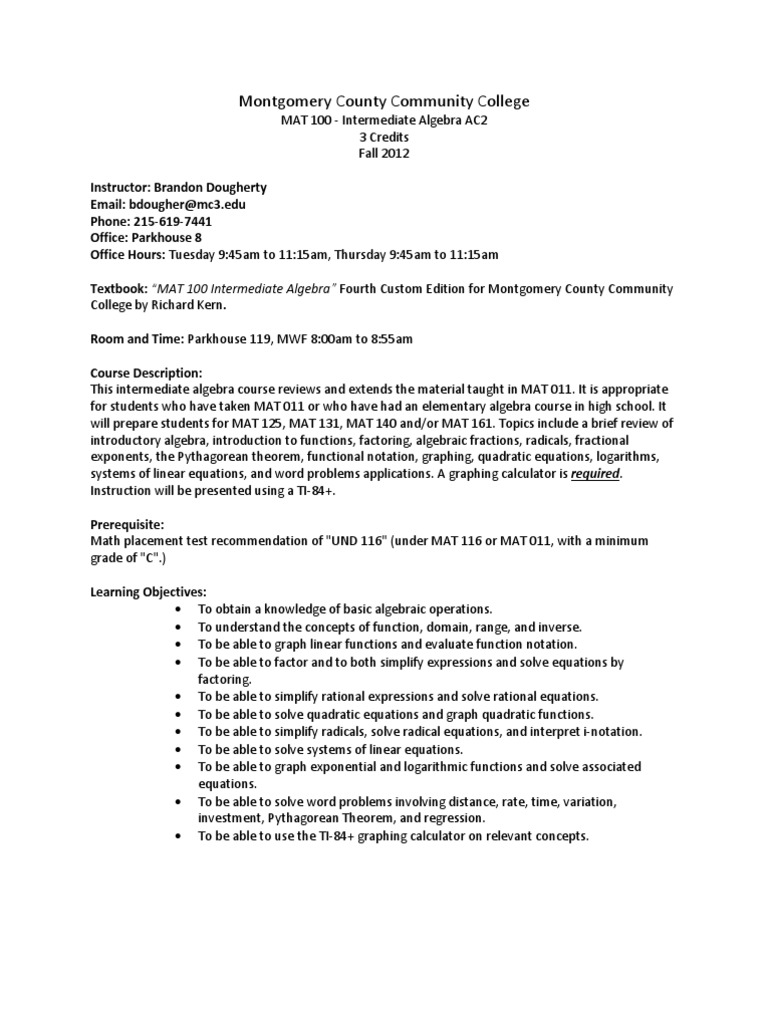 MAT 100 - Intermediate Algebra AC2 3 Credits Fall 2012 Instructor: Brandon Dougherty Email: bdougher@mc3.edu Phone: 215-619-7441 Office: Parkhouse 8 Office Hours: Tuesday 9:45am to 11:15am, Thursday 9:45am to 11:15am Textbook: MAT 100 Intermediate Algebra Fourth Custom Edition for Montgomery County Community College by Richard Kern. Room and Time: Parkhouse 119, MWF 8:00am to 8:55am Course Description: This intermediate algebra course reviews and extends the material taught in MAT 011. It is appropriate for students who have taken MAT 011 or who have had an elementary algebra course in high school. It will prepare students for MAT 125, MAT 131, MAT 140 and/or MAT 161. Topics include a brief review of introductory algebra, introduction to functions, factoring, algebraic fractions, radicals, fractional exponents, the Pythagorean theorem, functional notation, graphing, quadratic equations, logarithms, systems of linear equations, and word problems applications. A graphing calculator is required. Instruction will be presented using a TI-84+. Prerequisite: Math placement test recommendation of "UND 116" (under MAT 116 or MAT 011, with a minimum grade of "C".) Learning Objectives: To obtain a knowledge of basic algebraic operations. To understand the concepts of function, domain, range, and inverse. To be able to graph linear functions and evaluate function notation. To be able to factor and to both simplify expressions and solve equations by factoring. To be able to simplify rational expressions and solve rational equations. To be able to solve quadratic equations and graph quadratic functions. To be able to simplify radicals, solve radical equations, and interpret i-notation. To be able to solve systems of linear equations. To be able to graph exponential and logarithmic functions and solve associated equations. To be able to solve word problems involving distance, rate, time, variation, investment, Pythagorean Theorem, and regression. To be able to use the TI-84+ graphing calculator on relevant concepts.