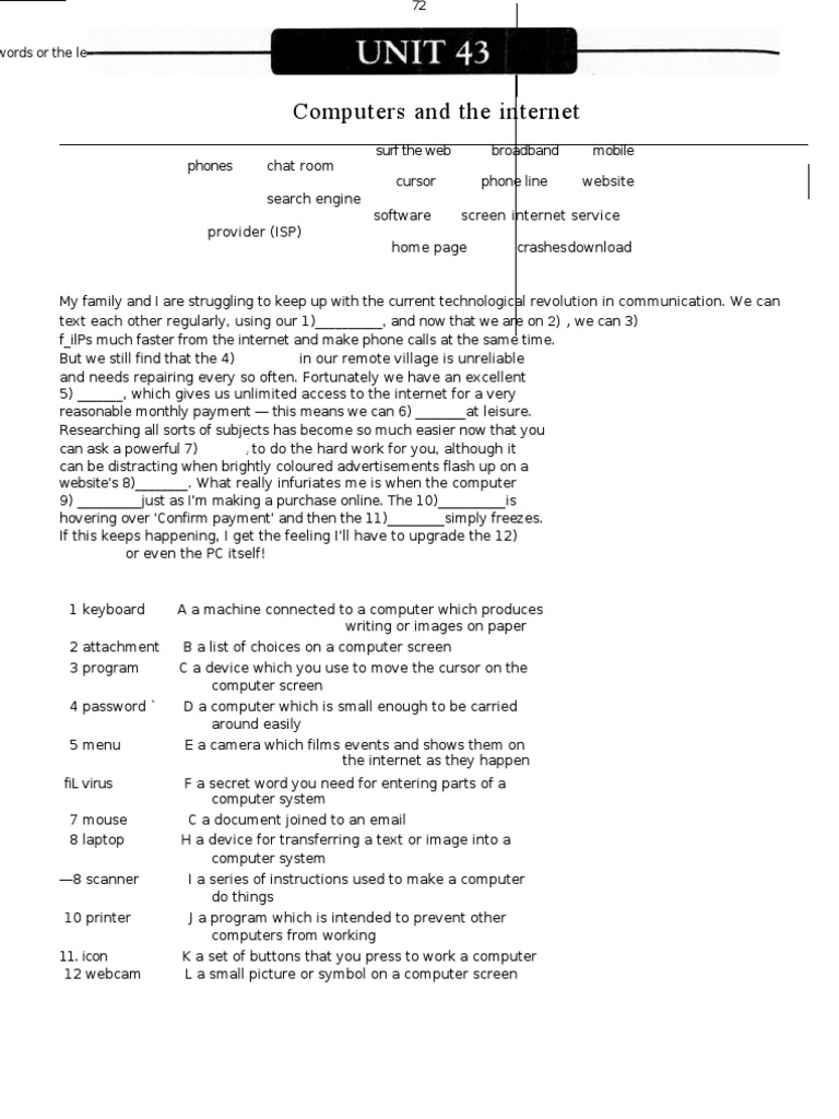 My family and I are struggling to keep up with the current technological revolution in communication. We can text each other regularly, using our 1)__________, and now that we are on 2) , we can 3) f_ilPs much faster from the internet and make phone calls at the same time. But we still find that the 4) in our remote village is unreliable and needs repairing every so often. Fortunately we have an excellent 5) _______, which gives us unlimited access to the internet for a very reasonable monthly payment this means we can 6) ________at leisure. Researching all sorts of subjects has become so much easier now that you can ask a powerful 7) to do the hard work for you, although it can be distracting when brightly coloured advertisements flash up on a website's 8)________. What really infuriates me is when the computer 9) __________just as I'm making a purchase online. The 10)___________is hovering over 'Confirm payment' and then the 11)_________simply freezes. If this keeps happening, I get the feeling I'll have to upgrade the 12) or even the PC itself!