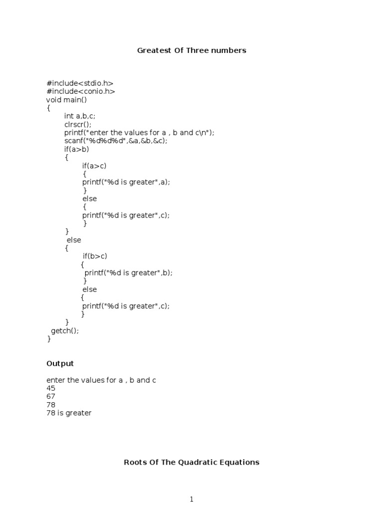 #include<stdio.h> #include<conio.h> void main() { int a,b,c; clrscr(); printf("enter the values for a , b and c\n"); scanf("%d%d%d",&a,&b,&c); if(a>b) { if(a>c) { printf("%d is greater",a); } else { printf("%d is greater",c); } } else { if(b>c) { printf("%d is greater",b); } else { printf("%d is greater",c); } } getch(); } Output enter the values for a , b and c 45 67 78 78 is greater
