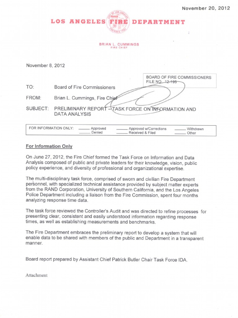 Executive Summary During recent months, a number of issues arose that brought to question the reliability of response times reported by the Los Angeles Fire Department. In order to address these concerns, and to ensure public confidence, Fire Chief Brian L. Cummings, with the full encouragement and support from the Board of Fire Commissioners, appointed a task force to identify potential issues and provide recommendations and solutions related to the Department's information and data analysis. This Task Force on Information and Data Analysis ("Task Force IDA") is comprised of subject matter experts from within the LAFD, and works in close conjunction with technical advisors from RAND and USC. Fire Commissioner Alan J. Skobin serves as the Fire Commission liaison and provides guidance, support, and leadership. Additionally, the subcommittee included recommendations from Mr. Jeff Godown, who formally served as a performance and data management consultant for the department and who identified some issues and provided support. Task Force IDA established three separate tracks, each with specific and measurable objectives: Track 1- Data Accuracy/Interpretation, Track 2 Research Plan and Development of FIRESTATLA1, a data driven and accountability system, which will enable the LAFD to use leading-edge technology and innovative management techniques to enhance Department performance, accountability and transparency. Track 3 - Implementation of FIRESTATLA and other performance measurements. In order to effectively address the first track of data accuracy and interpretation, the Task Force subcommittee developed a process which included problem definition,