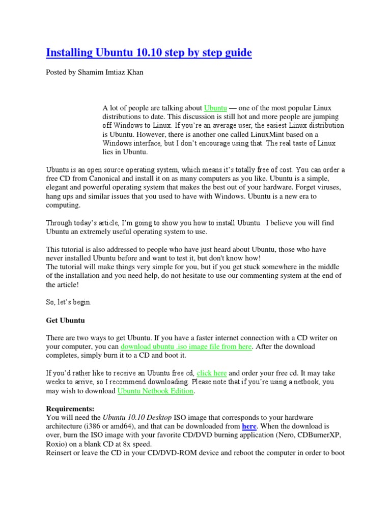 A lot of people are talking about Ubuntu one of the most popular Linux distributions to date. This discussion is still hot and more people are jumping off Windows to Linux. If youre an average user, the easiest Linux distribution is Ubuntu. However, there is another one called LinuxMint based on a Windows interface, but I dont encourage using that. The real taste of Linux lies in Ubuntu. Ubuntu is an open source operating system, which means its totally free of cost. You can order a free CD from Canonical and install it on as many computers as you like. Ubuntu is a simple, elegant and powerful operating system that makes the best out of your hardware. Forget viruses, hang ups and similar issues that you used to have with Windows. Ubuntu is a new era to computing. Through todays article, Im going to show you how to install Ubuntu. I believe you will find Ubuntu an extremely useful operating system to use. This tutorial is also addressed to people who have just heard about Ubuntu, those who have never installed Ubuntu before and want to test it, but don't know how! The tutorial will make things very simple for you, but if you get stuck somewhere in the middle of the installation and you need help, do not hesitate to use our commenting system at the end of the article! So, lets begin. Get Ubuntu There are two ways to get Ubuntu. If you have a faster internet connection with a CD writer on your computer, you can download ubuntu .iso image file from here. After the download completes, simply burn it to a CD and boot it. If youd rather like to receive an Ubuntu free cd, click here and order your free cd. It may take weeks to arrive, so I recommend downloading. Please note that if youre using a netbook, you may wish to download Ubuntu Netbook Edition. Requirements: You will need the Ubuntu 10.10 Desktop ISO image that corresponds to your hardware architecture (i386 or amd64), and that can be downloaded from here. When the download is over, burn the ISO image with your favorite CD/DVD burning application (Nero, CDBurnerXP, Roxio) on a blank CD at 8x speed. Reinsert or leave the CD in your CD/DVD-ROM device and reboot the computer in order to boot