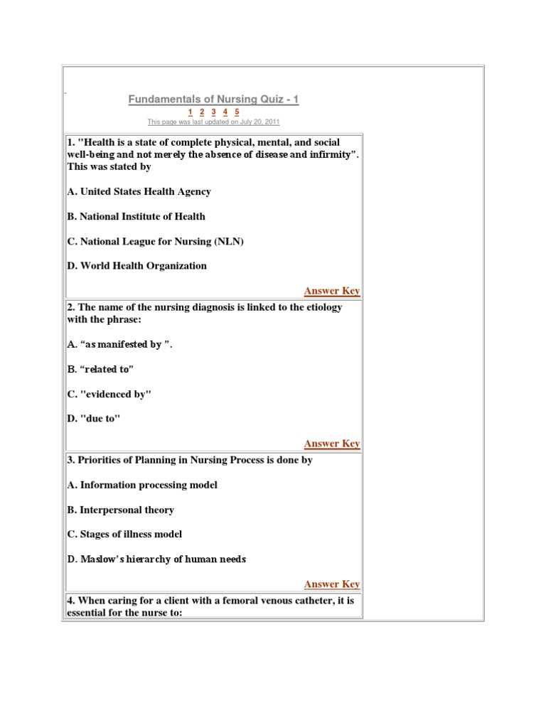 1. "Health is a state of complete physical, mental, and social well-being and not merely the absence of disease and infirmity. This was stated by A. United States Health Agency B. National Institute of Health C. National League for Nursing (NLN) D. World Health Organization Answer Key 2. The name of the nursing diagnosis is linked to the etiology with the phrase: A. as manifested by . B. related to C. "evidenced by" D. "due to" Answer Key 3. Priorities of Planning in Nursing Process is done by A. Information processing model B. Interpersonal theory C. Stages of illness model D. Maslows hierarchy of human needs Answer Key 4. When caring for a client with a femoral venous catheter, it is essential for the nurse to: A. irrigate the catheter with sterile saline solution to maintain patency. B. maintain sterile technique when working with the catheter.