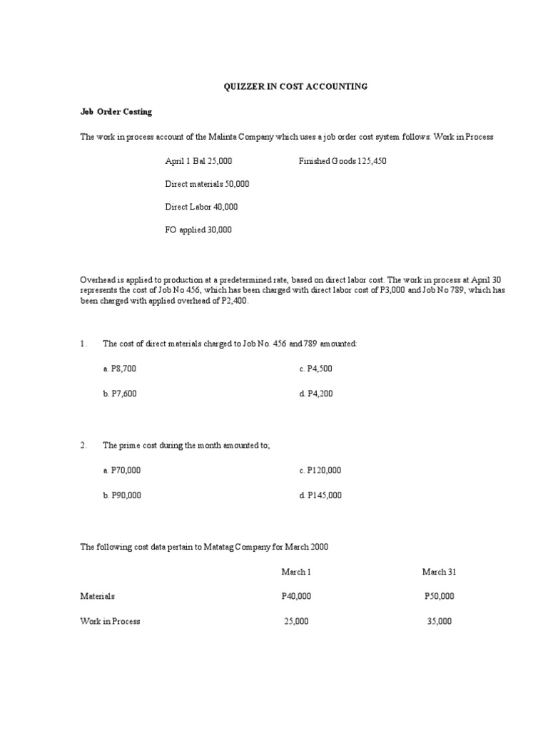 QUIZZER IN COST ACCOUNTING Job Order Costing The work in process account of the Malinta Company which uses
