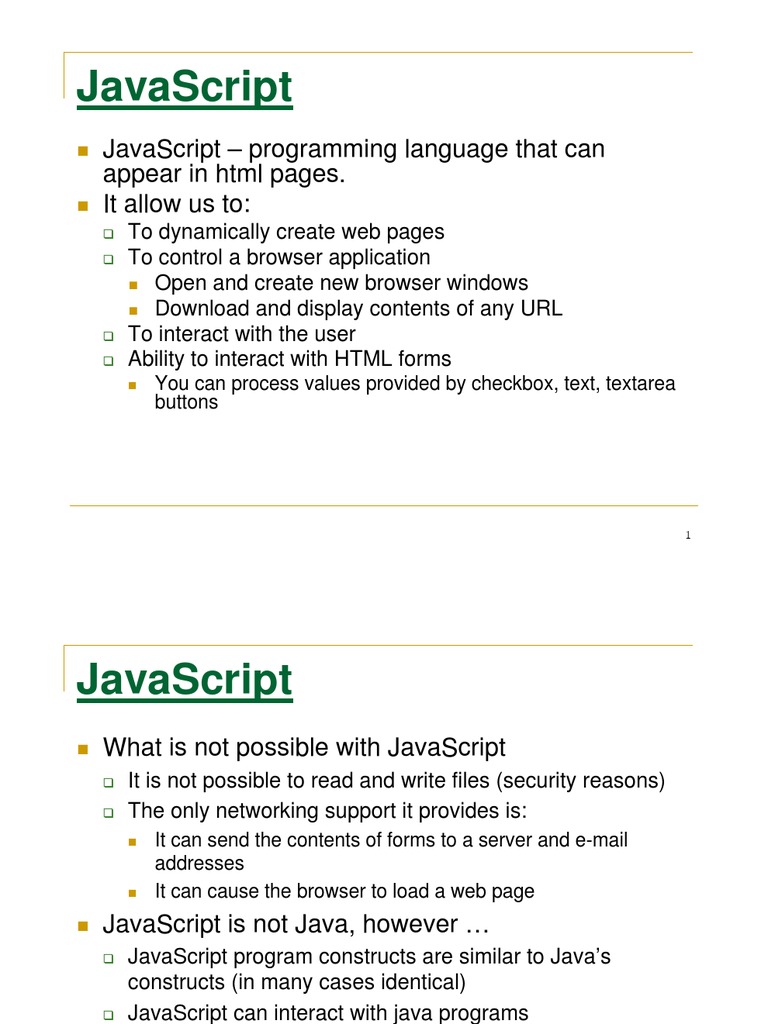 When learning JavaScript we can identify two main areas Core JavaScript Set of rules specifying how to write JavaScript programs Client-Side JavaScript How JavaScript is used in web browsers A JavaScript program can appear In a file by itself in a file typically with the extension .js In html files between a <script> and </script> tags Example1 We use document.writeln to create the page contents Notice the html tags present in the writeln