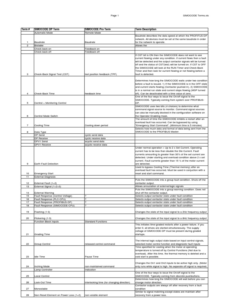 Term Description Uses S1 and S2 inputs to determine input control source(s). If enabled, OPO input must be ON before a RUN command will be issued. Once running, if the OPO turns OFF, the contactor is turned OFF and an OPO fault is issued. Local motor control Physical output relays used to drive contactors or annunciate signals. One of the four ways to issue the On/off signal to the SIMOCODE. Typically coming from the PLC/DCS system over PROFIBUS-DP. Value from 1-126. Each PROFIBUS slave active on the network must have a unique address. If enabled and RTS is OFF, a general and RTS faults are issued and the contactor is turned OFF. Faults are reset automatically when RTS is ON again Used to acknowledge existing faults instead of the manual reset button on the SIMOCODE or Operator Panel. Determines how long the SIMOCODE waits under two condition before a fault is issued. 1) If the SIMOCODE is in the OFF state, MSP is turned OFF and a start command is given. 2) SIMOCODE is in a normal run state, a stop command is given and current keeps flowing (Contactor held in).Can be deactivated with a time value of zero.