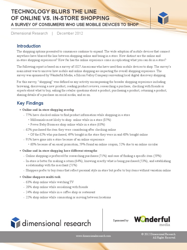 The shopping options presented to consumers continue to expand. The wide adoption of mobile devices that connect anywhere have blurred the line between shopping online and being in a store. How distinct are the online and in-store shopping experiences? How far has the online experience come in replicating what you can do in a store? The following report is based on a survey of 1027 Americans who have used their mobile devices to shop. The surveys main intent was to uncover how mobile and online shopping are impacting the overall shopping experience. The survey was sponsored by Wanderful Media, a Silicon Valley Company reinventing local digital discovery shopping. browsing, discovering a new product, reading product reviews, researching a purchase, checking with friends or experts about what to buy, asking the retailer questions about a product, purchasing a product, returning a product, sharing details of a purchase on social media, and so on.