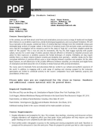 Arnim Alex Seelig v MODULE 1: NO WAR WITHOUT REPRESENTATION LANGUAGES AND NARRATIVES OF WAR ON FILM The next three weeks constitute an introductory module dedicated to laying a foundation for the film analyses made later in the course, by introducing key concepts in film theory. Another goal of this module is to assess and/or create the awareness among the students that filmic depictions of war are representations and that as such they are always subject to manipulation. Week 2: Narrative Devices in Cinema from Silent Film Until Today (Key Concepts in Film Analysis) Elsaesser, Thomas, and Malte Hagener. Film Theory: An Introduction through the Senses. New York: Routledge, 2010. 13-34 [ch. 1] Print. Virilio, Paul. War and Cinema : The Logistics of Perception. London; New York: Verso, 1989. 1-11 [preface to the English edition & ch. 1]. Print. Battleship Potemkin (1925); Birth of a Nation (1915). In this week, the students attention will be steered towards editing techniques in film. Invisible editing/continuity editing and the 180 rule will be discussed and contrasted with Eisensteins discussion of the various types of montage. This will be illustrated with sequences from Battleship Potemkin, giving examples of dialectically conflicting images as described by Eisenstein. Griffiths Birth of a Nation will illustrate how continuity editing and the 180 rule work as a narrative devices, for example in order to create the impression of simultaneous events. Additional examples from more recent films may be given in order to show that the same editing techniques are still at work in film today, while students are encouraged to come up with their own examples. Week 3: The Effects of WWI on Weimar Cinema Kaes, Anton. Shell Shock Cinema: Weimar Culture and the Wounds of War. Princeton: Princeton University Press, 2009. 1-34 [introduction and parts of Ch. 1]. Print. Rickels, Laurence. The Demonization of the Home Front: War Neurosis and Weimar