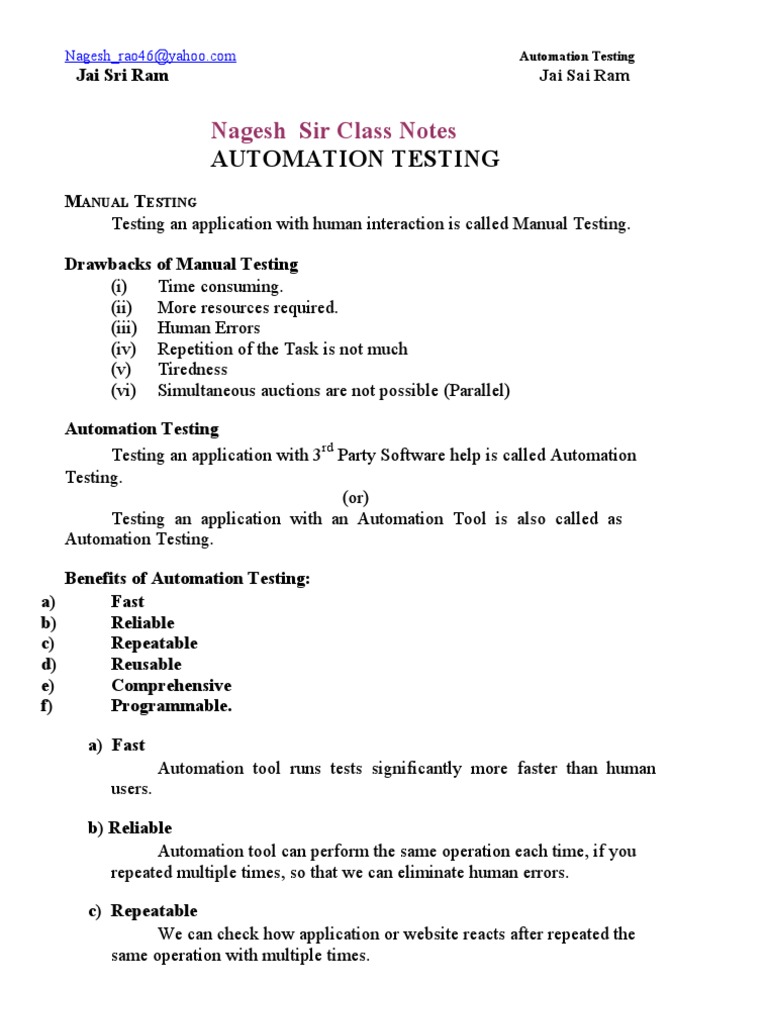 d) Reusable Automation scripts are reusable on different version of the application of websites even if the user interfaces changes. e) Comprehensive In automation testing we can build a suit of tests that covers every feature in the application or website. f) Programmable. We can program sophisticated Tests that bring out hidden information from the application. 1) 2) 3) 4) Drawbacks of Automation Testing It is expensive We cannot automate all areas. Lack of expertisation. It has some limitations (It cannot test every thing) Which Software Testing should be automated? Tests that need to be execute of every build of the application (Sanity Testing) Tests that use multiple data values (Retesting / Data Drives Testing) Tests that required data from application intimates (G.U.I. Attributes) Load and Stress Testing Which Software Testing should not be automated? Usability Testing One time testing Quick look Tests or A.S.A.P (As soon as possible) Testing Ad-hoc testing / Random Testing Customers requirement are frequently changing. Type of Tools Generally they are (4) Types of tools are available in the market. They are Functional Tools: QTP, WinRunner, Silktest, Rational Robot, TestPartner, etc., Performance Tools: LoadRunner, J-Meter etc., Test Management Tools: Quality Center (QC), Test Director. Version Control Tools VSS (Visual Safe Source), PVCS (Polytron Version Control System) etc.,