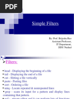 Topics covered: using UNIX pipes Utilities covered: sort, cat, head Pipes are used for post-processing data One UNIX command prints results to the standard output (usually the screen), and another command reads that data and processes it sort /etc/passwd | head -5 Notice that this pipe can be simplified cat /etc/passwd | head -5 You could accomplish the same thing more efficiently with either of the two commands: head -5 /etc/passwd head -5 < /etc/passwd For example, this command displays all the files in the current directory sorted by file size ls -al | sort -n -r +4 The command ls -al writes the file size in the fifth column, which is why we skip the first four columns using +4. The options -n and -r request a numeric sort (which is different than the normal alphabetic sort) in reverse order Page 4